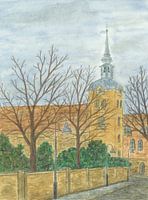 Deze aquarel toont de Flensburgse kerk St. Johannis in de mist.