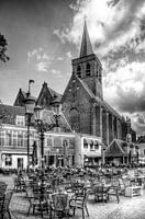 De Hof is voor veel Amersfoorters een bekend plein waar het gehele jaar goed toeven is. De vele terrasjes met haar bezoekers zeggen genoeg, vooral als de zon weer voldoende warmte geeft. Centraal op dit plein zie je de St. Joriskerk. Een bijzonder mooi ingerichte kerk na een knappe restauratie. De combinatie van kerk en terrasjes maakt het bezoeken van historisch Amersfoort extra aantrekkelijk. Deze foto is in de winter om 10.00 uur 's morgens genomen, vandaar de lege terrasjes