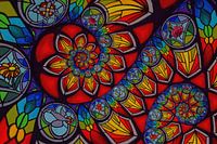 Ik heb het schilderij van mijn vrouw van het St. Joseph Church Rose Window gebruikt om een Droste-effect te creëren met een dubbele spiraal-transformatie. De vier ruitmotieven in het raam bevatten de symbolische bloemen: roos, iris, lelie, madeliefje. De vier vierpasmotieven bevatten religieuze tekens: kruis, regenboog met hand, alfa en omega, duif. De Griekse letters alpha en omega staan voor “het begin en het einde”. Dit correspondeert met alle motieven van het raam die vloeiend doorlopen van het ene spiraal-middelpunt naar het andere.