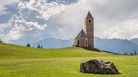13e eeuwse romaanse kerk in de glooiende groene heuvels van zuid-tirol in Italië