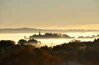 Kirchtum in de mist, zonsopgang, mist boven Vilmnitz bij Putbus op Rügen, St. Magdalena kerk