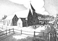 Zwart/wit pentekening op papier door Pieter Ringoot (1976) gesigneerd. Getekend naar aanleiding van een bezoek aan het Verenigd Koninkrijk in 1976.