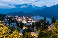 Uitzicht over Sankt Moritz en de Sankt Moritzersee in het Engadin in de avond, Grisons, Zwitserland.