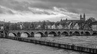 Zwartwitopname van de Sint Servaasbrug, de Maas met op de achtergrond het centrum en de Basiliek van Onze Lieve Vrouwe in Maastricht