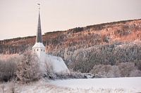 De staafkerk van Lillehammer in de winter met sneeuw.