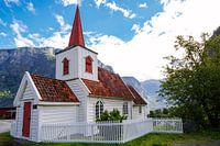 Het kleinste staafkerkje van Scandinavië in Undredal aan de Aurlandsfjord in Noorwegen.