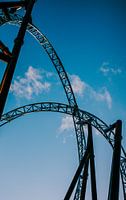 Strakke stalen bogen tekenen dynamische curven in een heldere lucht. Deze minimalistische close-up van een achtbaan vangt pure beweging, techniek en zomerse lichtheid in één beeld. Een krachtige print voor moderne interieurs, kantoren en studio’s—perfect voor liefhebbers van architectuur, design en pretpark-nostalgie.