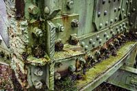 Bouten moeren klinknagels sporen van snijbranders en de plakken mos. Dit onderdeel van de oude Hembrug als monument in Zaandam. Zo werd vroeger een brug in gebouwd. Een hoop ambachten in een foto van klinkers tot staalwerkers.