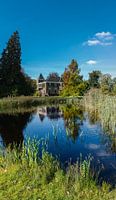 groot staand panorama van de achterkant van het huis Boekesteyn, 's-Graveland, Wijdemeren, Noord Holland, Netherlands. Een van de 's-Gravelandse buitenplaatsen van Natuurmonumenten, voorheen een vestiging van Philips Duphar en Solvay Nederland