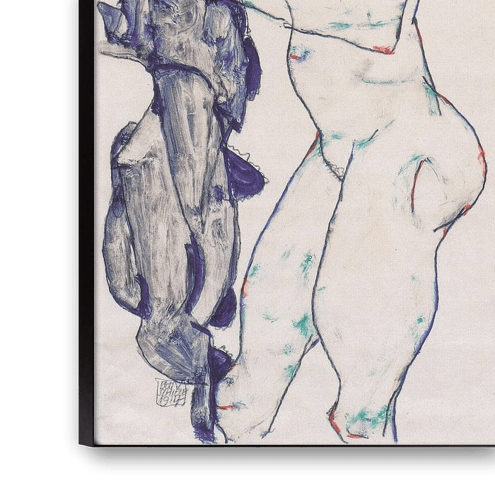Door het sterke gebruik van lijnen kan Schiele eerder als een tekenaar dan als een schilder gezien worden. Kleur in de schilderijen wordt pas achteraf aangebracht. Het kleurgebruik versterkt echter wel de vervreemdende werking in hoge mate. De werken van Schiele hebben een kubistisch karakter. De schilder gebruikt krachtige hoekige lijnen. De afgebeelde lichamen worden hierdoor als vreemd en vaak beangstigend ervaren. Vrouwen zowel als mannen worden meedogenloos in hun naaktheid weergegeven, in ongebruikelijke poses. Door de hoekige vormen van het lichaam, de onrealistische kleuren en de vaak panische blik in de ogen doen deze portretten zeer vervreemdend aan met een expliciet seksueel, narcistisch en exhibitionistisch karakter.