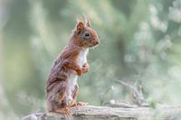 Het eekhoorntje kijkt nieuwsgierig op wat er allemaal gebeurt. Groen bokeh bosachtergrond. foto is in Noord Brabant in Nederland gemaakt.
