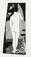 Tekening, prent of illustratie van een naakt lichaam van een volwassen dame in het zwartwit. Van de blote vrouw zijn benen, billen, heupen en rug zichtbaar.