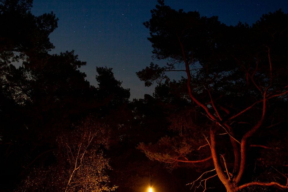 Licht in natuurlijke omgeving, zandvlakte in de nacht. Donkere bosrijke omgeving met gecentreerd licht.