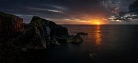 Panorama van Stac a' Phris Arch en hoge kliffen bij zonsondergang, Isle of Harris, Schotland