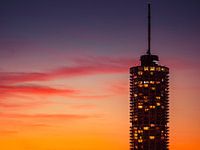 Wolkenkrabber in prachtige zonsondergangsstemming in Augsburg, Beieren, Duitsland.