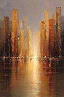 Stad in Gouden Reflectie is een abstract stadsgezicht dat warmte, rust en diepte uitstraalt. In dit kunstwerk worden de contouren van een moderne skyline op een subtiele en sfeervolle manier weergegeven. De hoge gebouwen rijzen op in warme tinten van goud, bruin en koper, en hun reflecties dansen zachtjes op het wateroppervlak. Deze dubbele weergave versterkt het gevoel van diepte en maakt het beeld tegelijkertijd mysterieus en dromerig.