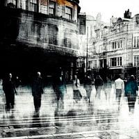 Een krachtig zwart-wit kunstwerk dat het ritme van de stad vangt. Mensen bewegen als schimmen door een grauwe straat, hun silhouetten vervagen in een waas van tijd en tempo. De techniek met beweging (langzame sluitertijd) zorgt voor een vervreemdend, haast filmisch beeld – als een herinnering die langzaam oplost. Deze foto vertelt over anonimiteit, over massa en mens, over de ongrijpbare stroom van het leven in de stad.