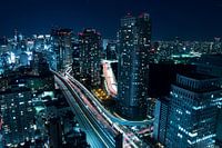een levendig stadsgezicht in de nacht, met tal van hoge gebouwen die verlicht zijn door kunstmatige verlichting. Het tafereel wordt gedomineerd door een netwerk van snelwegen met lichtsporen van bewegende voertuigen, wat wijst op een lange belichtingstijd bij het fotograferen. De gebouwen variëren in hoogte en ontwerp, met sommige die rode lichten bovenop hebben. De algehele sfeer is druk en dynamisch, wat de essentie van het stadsleven vastlegt. In de afbeelding zijn geen wiskunde- of huiswerkproblemen aanwezig.