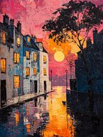 Het schilderij toont een straatbeeld met huizen in impressionistische stijl, badend in felle, vrolijke kleuren. Gevels in blauw dansen in losse, levendige penseelstreken over het doek. De lucht pulseert in tinten roze en geel, terwijl de ondergrond reflecties en schaduwen weergeeft in beweging. Het geheel straalt warmte, speelsheid uit.