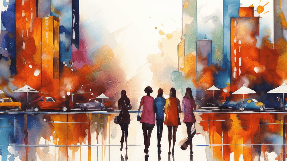 Stad met mensen panorama aquarel op witte achtergrond, kleur kunst ontwerp