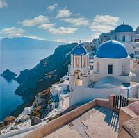 Stad op kraterrand, blauwe kerkkoepels, Oia, Santorini, Griekenland