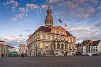 Gouden licht tijdens de zonsondergang op de markt in Maastricht.
