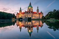 Het historische Nieuwe Stadhuis wordt na zonsondergang idyllisch weerspiegeld in de vijver achter het stadhuis.