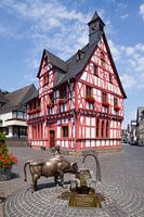 Stadhuis met fontein Viehtränke en Rhenser Ochsen op de marktplaats, Rhens, Ober-Mittelrheintal, Rijnland-Palts, Duitsland, Europa