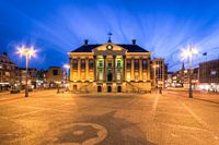 Het stadhuis van Groningen aan de Grote Markt in de vroege avond tijdens het blauwe uur. Het huidige stadhuis is gebouwd in twee fasen tussen 1793-1795 en 1802-1817.