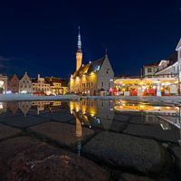 Stadhuis in Tallinn met weerspiegeling in plas in de avond