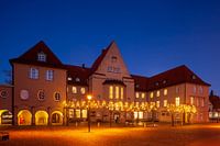 Stadhuis met kerstverlichting in de schemering, Delmenhorst, Nedersaksen, Duitsland