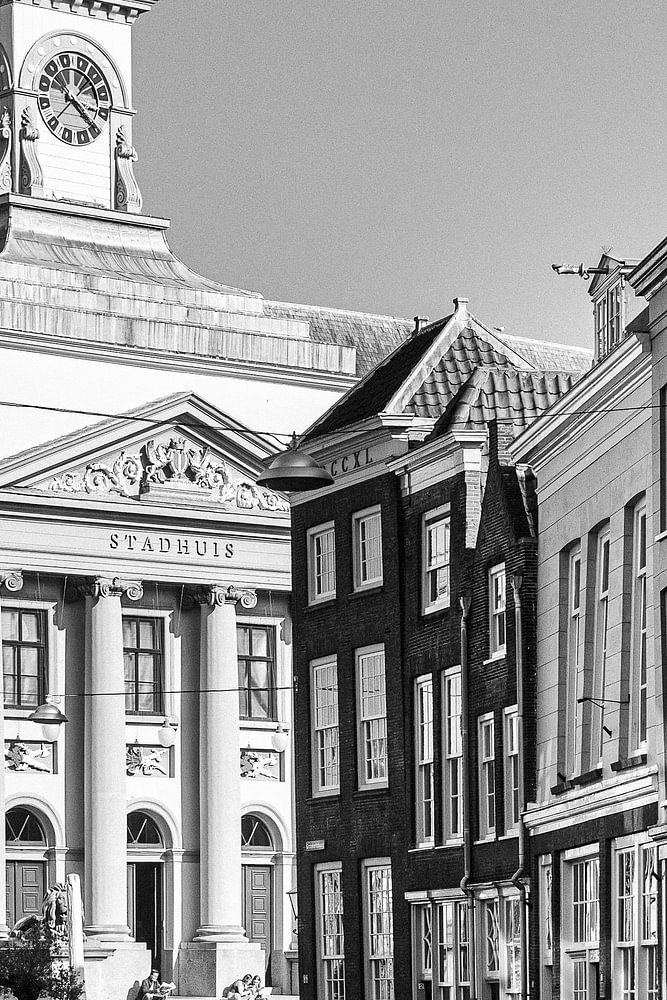 Sfeervolle plaat van het stadhuis van Dordrecht, prachtig beschenen door de middagzon. Op de voorgrond de Grotekerksbuurt met haar statige herenhuizen en klinkerweg.