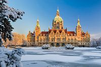 Stadhuis van Hannover, Duitsland in de winter met sneeuw en bevroren meer
