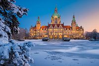 Stadhuis van Hannover, Duitsland in de winter met sneeuw en bevroren meer
