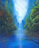 Het schilderij toont een mysterieuze vallei met water als hoofdmotief. In een scène gedomineerd door koel blauw en donkergroen ontvouwt zich een intieme en natuurlijke sfeer, alsof de natuur dit werk niet wil prijsgeven.