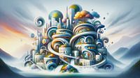 Een buitengewoon futuristisch stadslandschap waarin klassieke architectuur en natuurlijke elementen samensmelten tot een harmonieuze maar dynamische compositie. Kleuren en vormen creëren een sfeer van optimisme en vooruitgang.