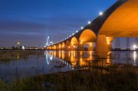 De nieuwe mooi vormgegeven stadsbrug De Oversteek in Nijmegen. Mooi verlicht, en mooie weerspiegeling en reflectie in het water van de rivier de Waal