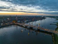 Kampen aan de oever van de IJssel tijdens zonsondergang van bovenaf gezien met de stadsbrug en de oude binnenstad van Kampen tijdens een herfstzonsondergang.