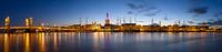 Stadsfront van de Hanzestad Kampen aan de IJssel in de avond met klassieke zeilschepen die aangemeerd zijn aan de kade. De foto is gemaakt tijdens het 'blauwe uurtje' net na zonsondergang. De lichtjes van de schepen worden weerspiegeld in het kalme water van de IJssel.