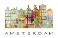 Dit mixed media kunstwerk toont een rij traditionele pakhuizen langs het Damrak in Amsterdam. De warme aquarel- en inktcompositie combineert realisme met een moderne artistieke benadering en benadrukt de architectonische charme en historische diepte van de stad. Elk gebouw is uniek gedetailleerd en weerspiegelt het karakter en ritme van de iconische straten langs de Amsterdamse grachten.