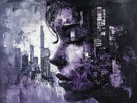 Stadsgezicht | City Soul - Dit stedelijke portretschilderij toont een vrouw wiens gezicht de skyline van een metropolis incorporeert, uitgevoerd in dominante paarse en zwarte tinten met een abstract, futuristisch gevoel.