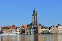Foto van de Deventer, Overijssel, weerspiegeld in de IJssel op een zonnige dag met prachtig blauwe lucht.