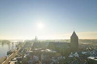 Kampen stadsgezicht aan de IJssel tijdens een koude winterse zonsopgang met lichte sneeuw op de daken. Kampen is een oude Hanzestad aan de oever van de IJssel in Overijssel, Nederland.