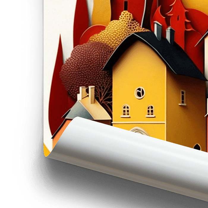 De charmante en gestileerde scène toont een schilderachtige verzameling kleurrijke huizen en gebouwen in een fantasierijk stadslandschap. De architectuur is gevarieerd, met puntdaken, torens en ongewone vormen. Het kleurenpalet is warm en herfstachtig, met gele, oranje, rode en bruine tinten die een gezellig contrast vormen met de heldere achtergrond. Gestileerde bomen met kleurrijke bladeren maken het tafereel compleet. De gebouwen lijken gemaakt van papier of karton, wat de illustratie een charmante, handgemaakte kwaliteit geeft.