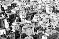 Stadsgezicht op het oude centrum van Ragusa, een stadje op Sicilië in Italië. Uitgevoerd als zwart-wit foto.