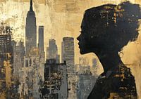 Stadsgezicht | Urban Grace - Dit stedelijk vrouw portret schilderij toont een krachtige vrouwelijke silhouet in zwarte tinten tegen een achtergrond van goud en grijs geschilderde wolkenkrabbers, waarbij het Empire State Building prominent zichtbaar is.