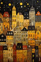 Dit werk toont een sfeervol stadsgezicht bij nacht, waarbij het spel van licht en schaduw een mysterieus en intrigerend effect creëert. De donkere tinten worden doorbroken door warme lichten die de architectuur en straten subtiel verlichten, wat zorgt voor een uitnodigende en bijna romantische sfeer. De stad lijkt tot leven te komen in het stille duister, met een rustige maar aanwezige energie.