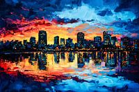 Dit levendige schilderij toont een stad bij zonsondergang met reflecties in het water. De expressieve penseelstreken en warme kleuren zoals oranje, rood en geel worden gebalanceerd door het diepe blauw van de lucht en het water. De skyline is abstract maar herkenbaar, wat het kunstwerk perfect maakt voor moderne interieurs. Ideaal als blikvanger in een woonkamer, kantoor of andere ruimte waar een vleugje dynamiek gewenst is. Dit schilderij straalt energie en elegantie uit en is een tijdloze keuze voor kunstliefhebbers.