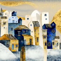In een scène die doet denken aan een dromerig dorp aan de rand van de hemel rijzen huizen op in een palet van blauwe en gouden tinten. Hun vormen zijn speels, bijna kinderlijk, en hun daken lijken op te gaan in de gouden lucht. De scène is een eerbetoon aan de verbeelding, waar architectuur en natuur in een harmonieuze omhelzing bestaan.