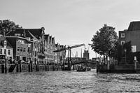 Vanaf het water in het historische centrum van Dordrecht is een oude brug te zien en daarachter de toren van de Grote Kerk.